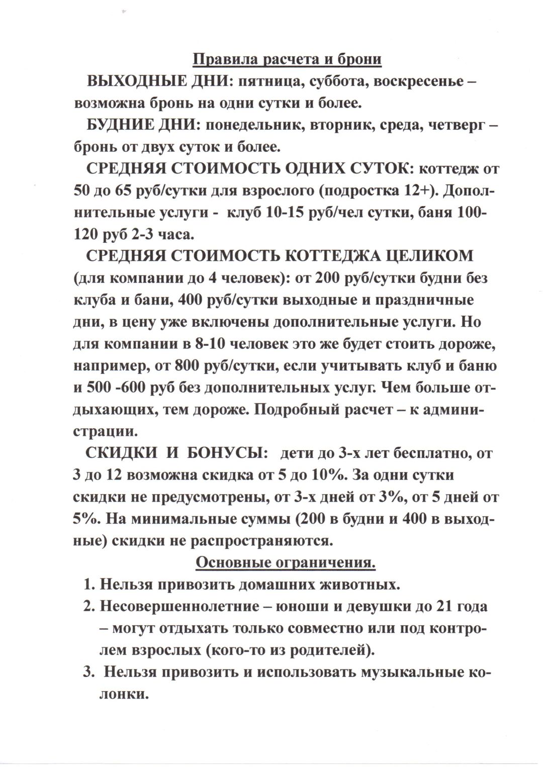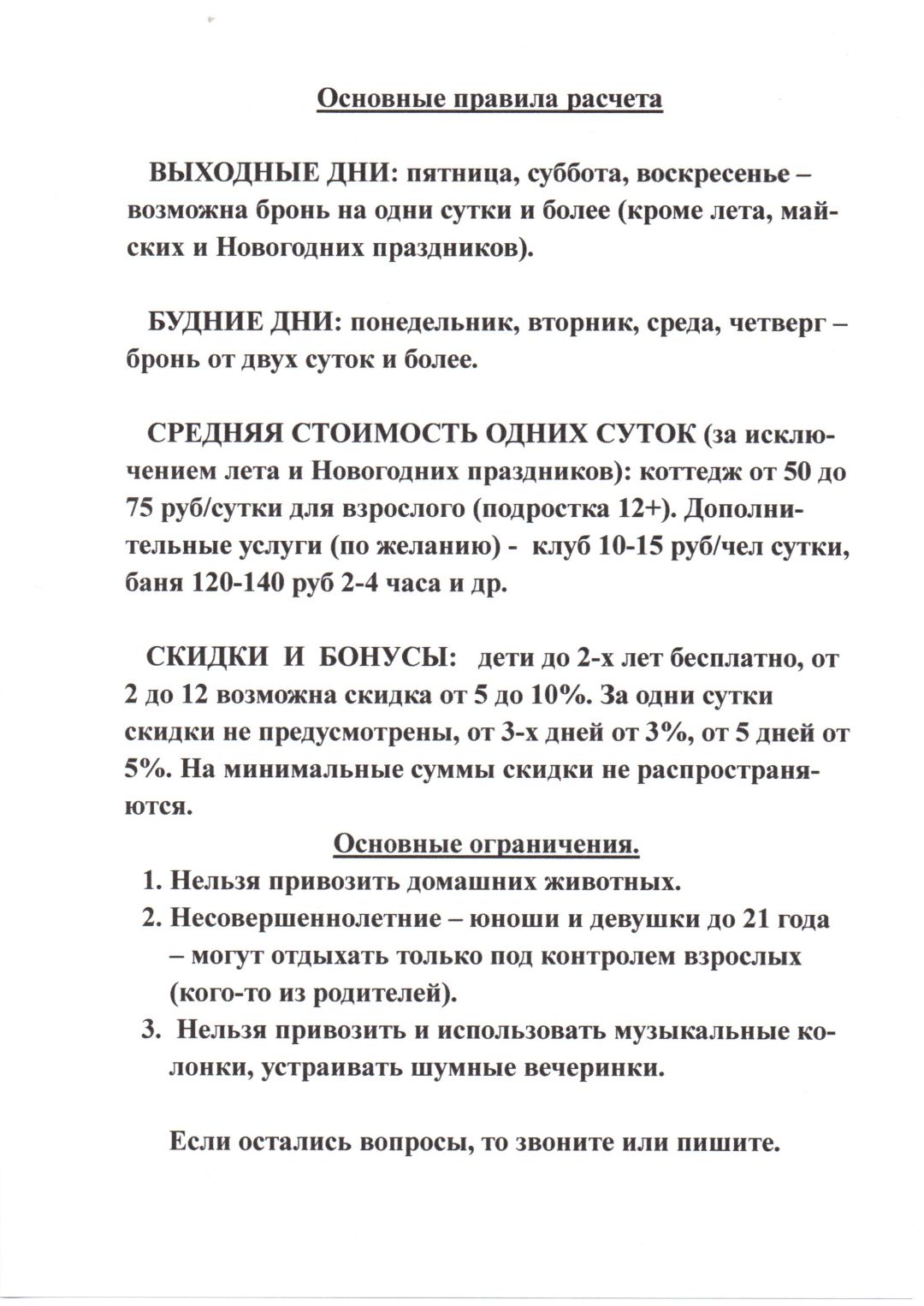 ОГРАНИЧЕНИЯ: коттедж расположен в жилой зоне и предназначен для проживания и комфортного культурного отдыха, поэтому на территорию нельзя привозить и использовать мощные электронные звуковые колонки, электроинструменты, электромикрофоны и т. д. Нельзя шуметь, кричать, мусорить, перелазить через забор, запускать салюты, фейерверки, петарды.